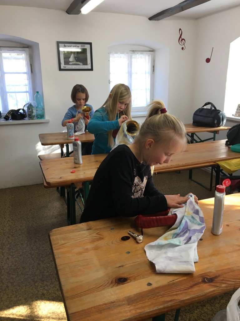 Doch auch unsere jüngeren Spielleute, welche noch nicht am Wettkampf teilnehmen, legten sich in den drei Tagen ins Zeug. In verschiedenen Übungsgruppen übten die Kinder fleißig an ihren Instrumenten, um schnellstmöglich den Sprung in den Wettkampzug zu meistern. Die drei Flöterinnen Emma, Ophelia und Jasmin sind ihrem Ziel im Trainingslager ein ganzes Stück näher gekommen, da sie zum ersten Mal ein Horn in die Hand nehmen und darauf die ersten Töne üben konnten.